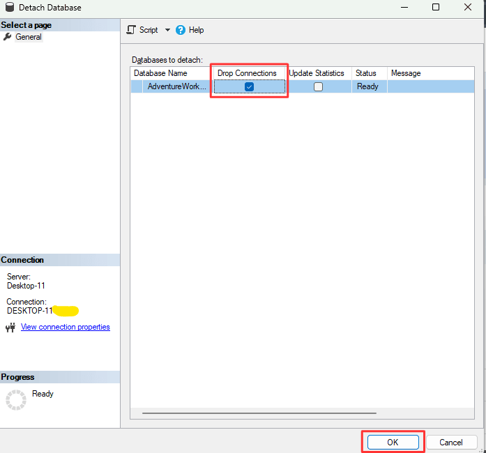 2. "Detach Database" dialog box will appear, Make sure that the "Drop Connections" option is checked >> Click "OK".